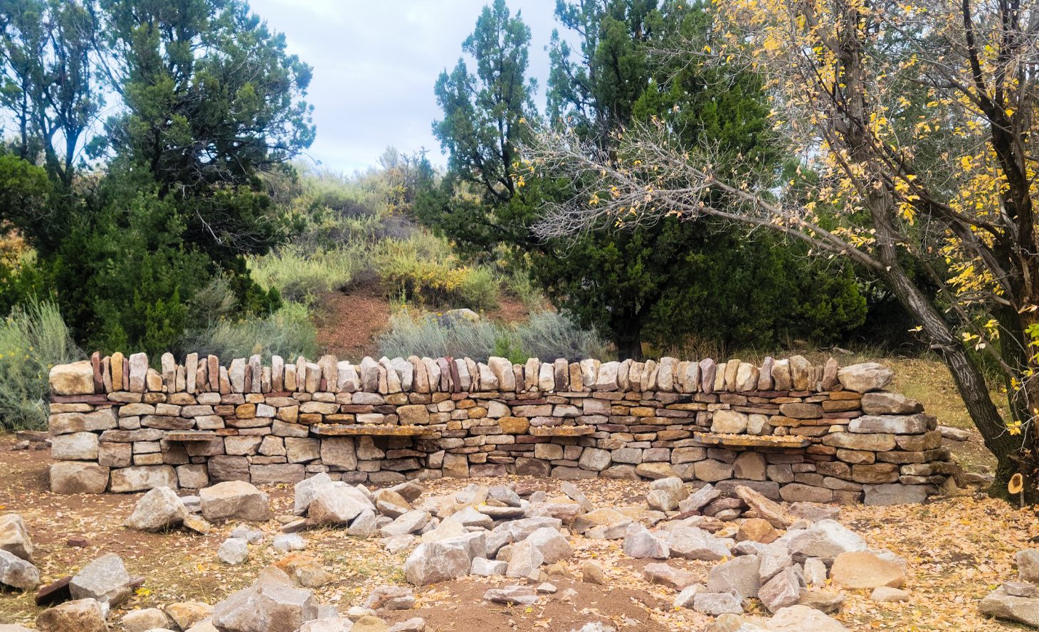Example of a double-sided seat wall built by 10 participants of a drystone walling workshop in Santa Fe, NM.
